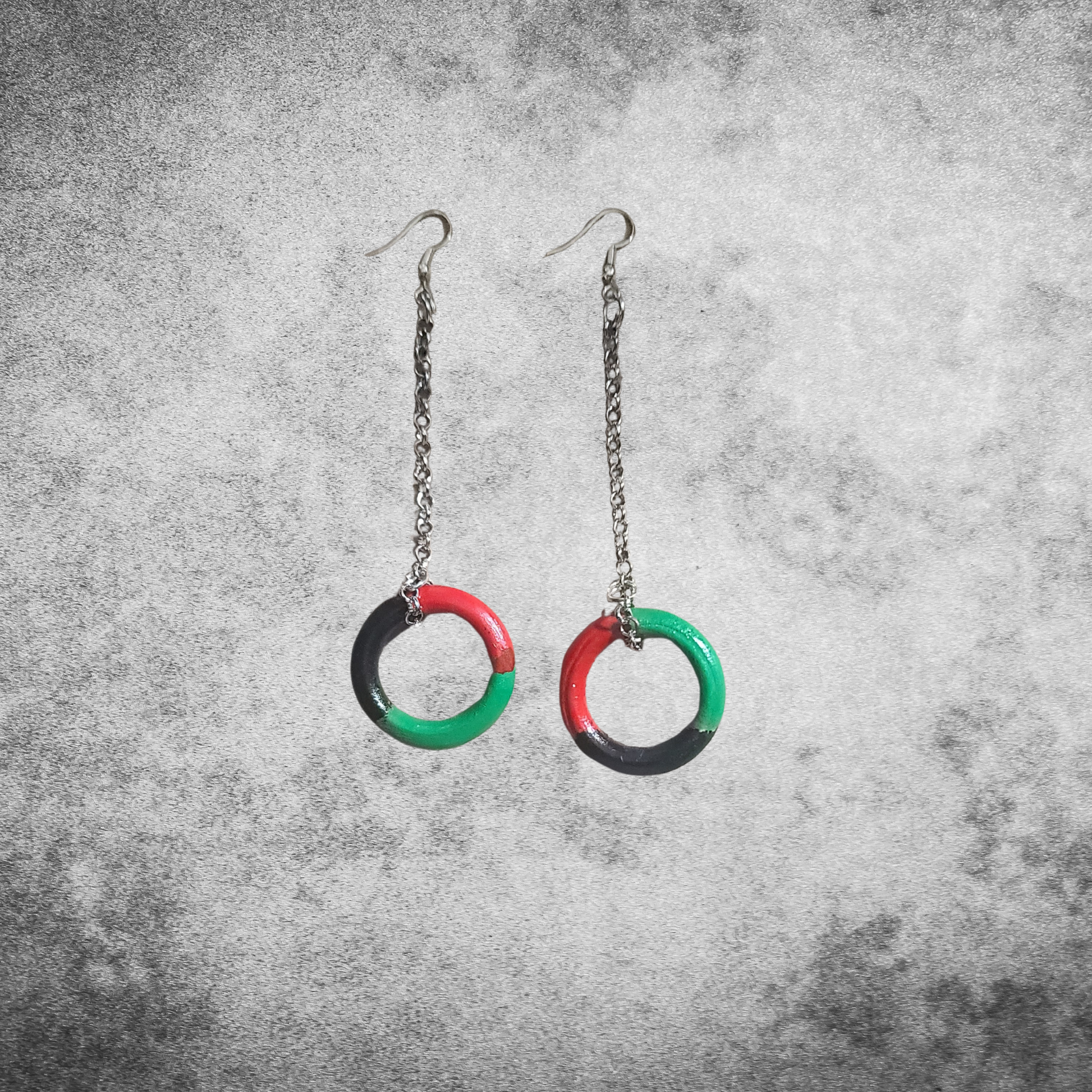 These earrings have gand painted wooden circles and chains they are appropriately 4 inches