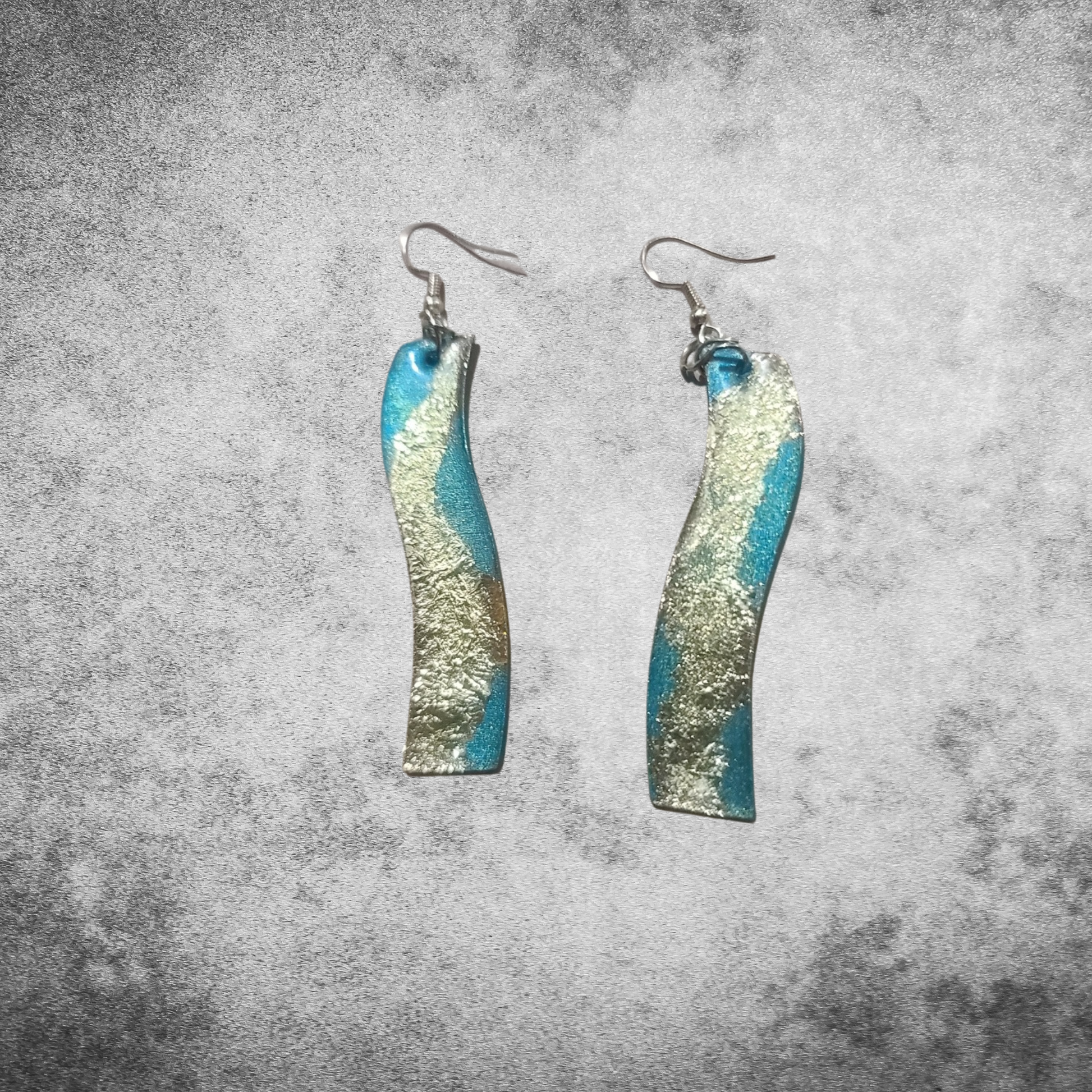 These are turquoise hand painted wooden earrings with gold accents. They are appropriately 3 1/2 inches long
