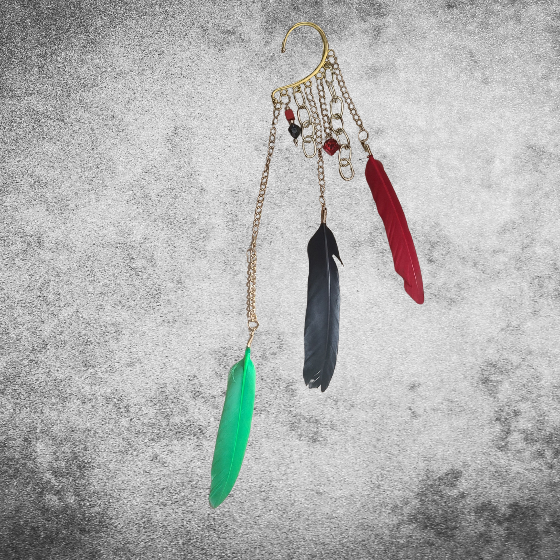 This is a gold ear cuff with feathers approximately 11 1/2 inches long